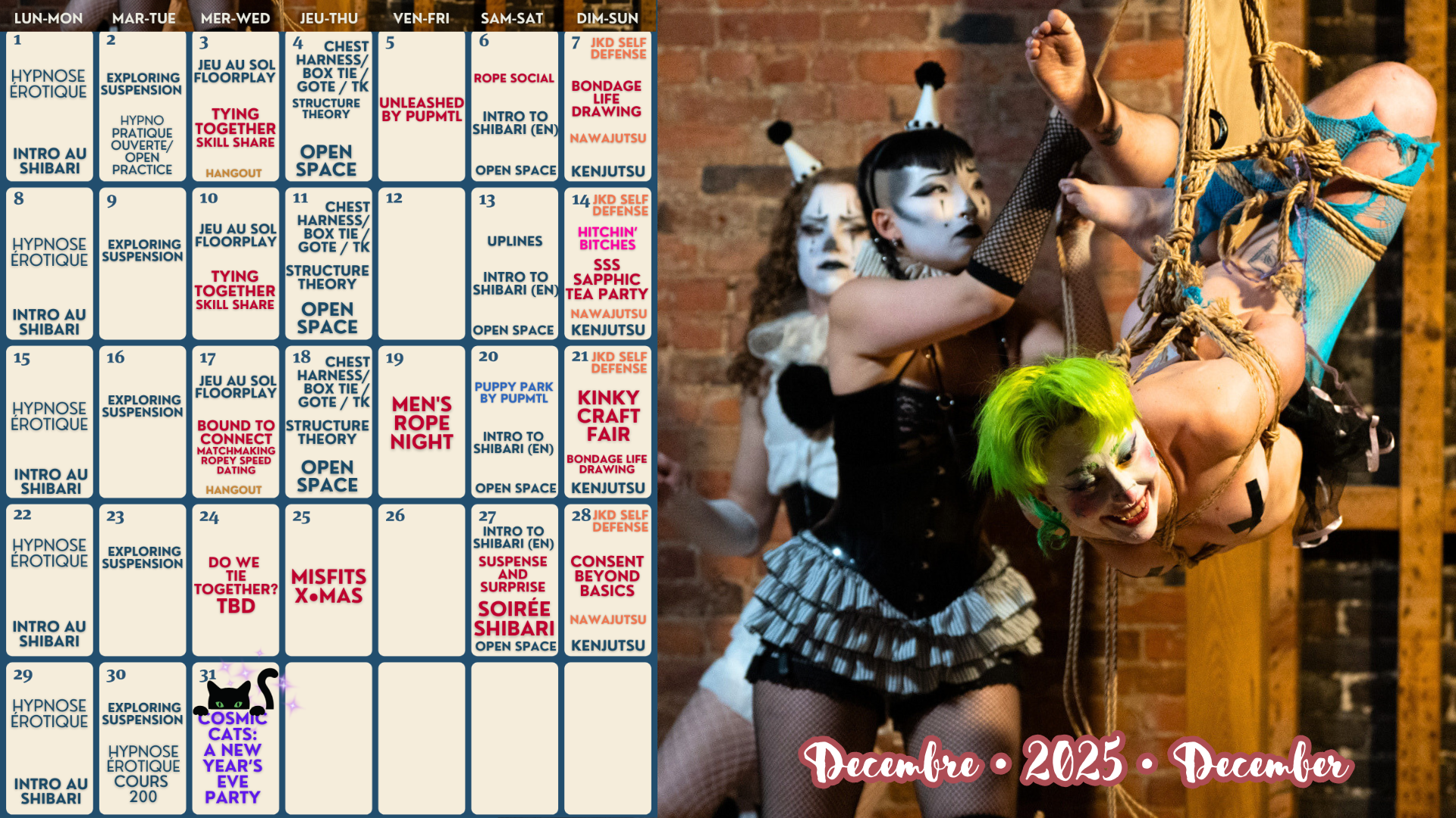 Nous sommes le studio de Shibari local de Montréal, un espace onirique et apaisant. Rejoignez-nous pour des cours de Shibari, des événements, des ateliers et bien plus encore pour une expérience de ligotage enrichissante.